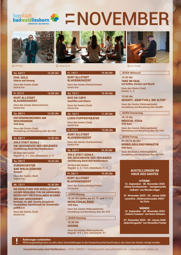 Willkommen bei unseren Neuigkeiten & Veranstaltungen! Hier finden Sie aktuelle Infos rund um Bad Waldliesborn und unsere Pension Pöhling. Entdecken Sie unterhaltsame Veranstaltungen, Programme und Angebote, die Ihren Aufenthalt noch abwechslungsreicher machen. Unsere regelmäßig aktualisierten Flyer halten Sie auf dem Laufenden über Events und Aktivitäten vor Ort – so verpassen Sie keine Gelegenheit, Bad Waldliesborn in seiner ganzen Vielfalt zu erleben.